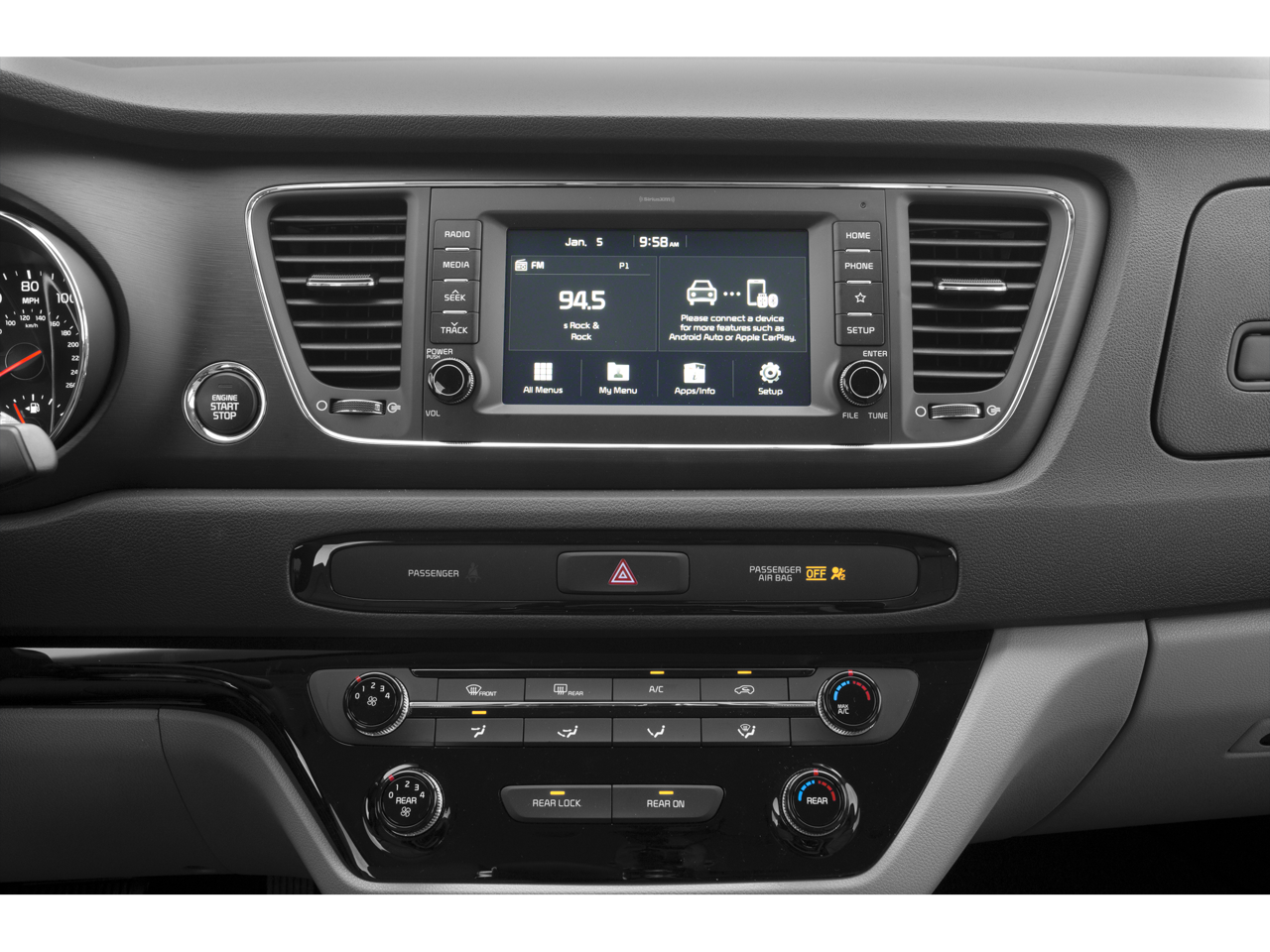 • Radio: AM/FM Audio System -inc: 6 speakers, 7.0" display UVO3, SIRIUS, Android Auto and Apple CarPlay, rear camera display, TMU, USB/auxiliary input jacks and front row and back of center console rapid charging USB