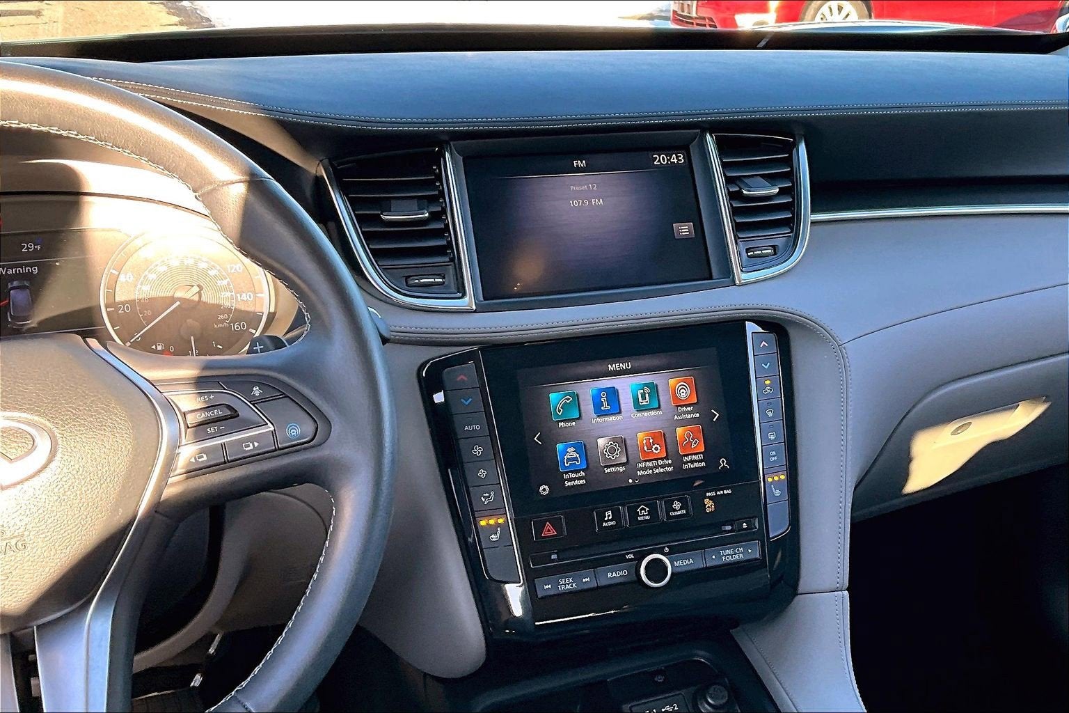- Radio: HD Audio System -inc: INFINITI InTouch, INFINITI InTouch services, INFINITI InTouch dual display system w/upper 8" and lower 7" HD touch screens, wireless Apple CarPlay, Android Auto, HD radio technology, SiriusXM radio w/advanced audio features and 90-day complimentary trial, INFINITI voice recognition, Siri Eyes Free, Wi-Fi hotspot and active noise cancellation